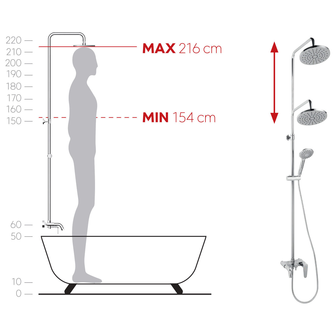 - Înălțime bară cap duș fix: 1076-1700 mm