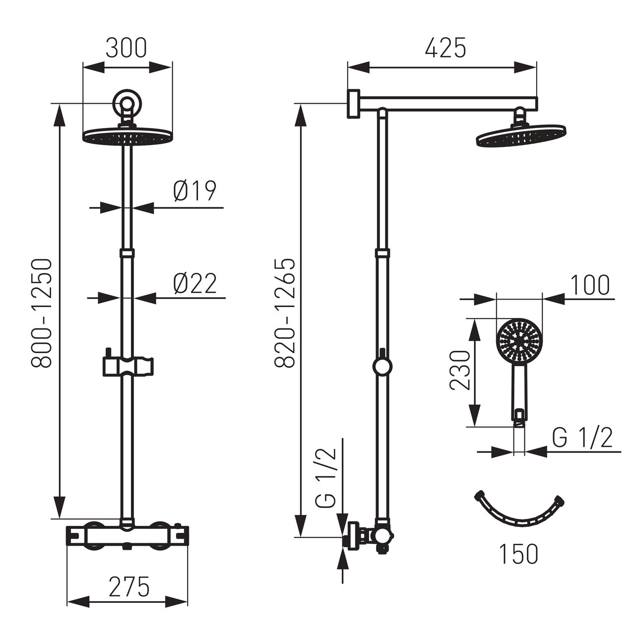 - Înălțime bară cap duș fix: 820-1265 mm