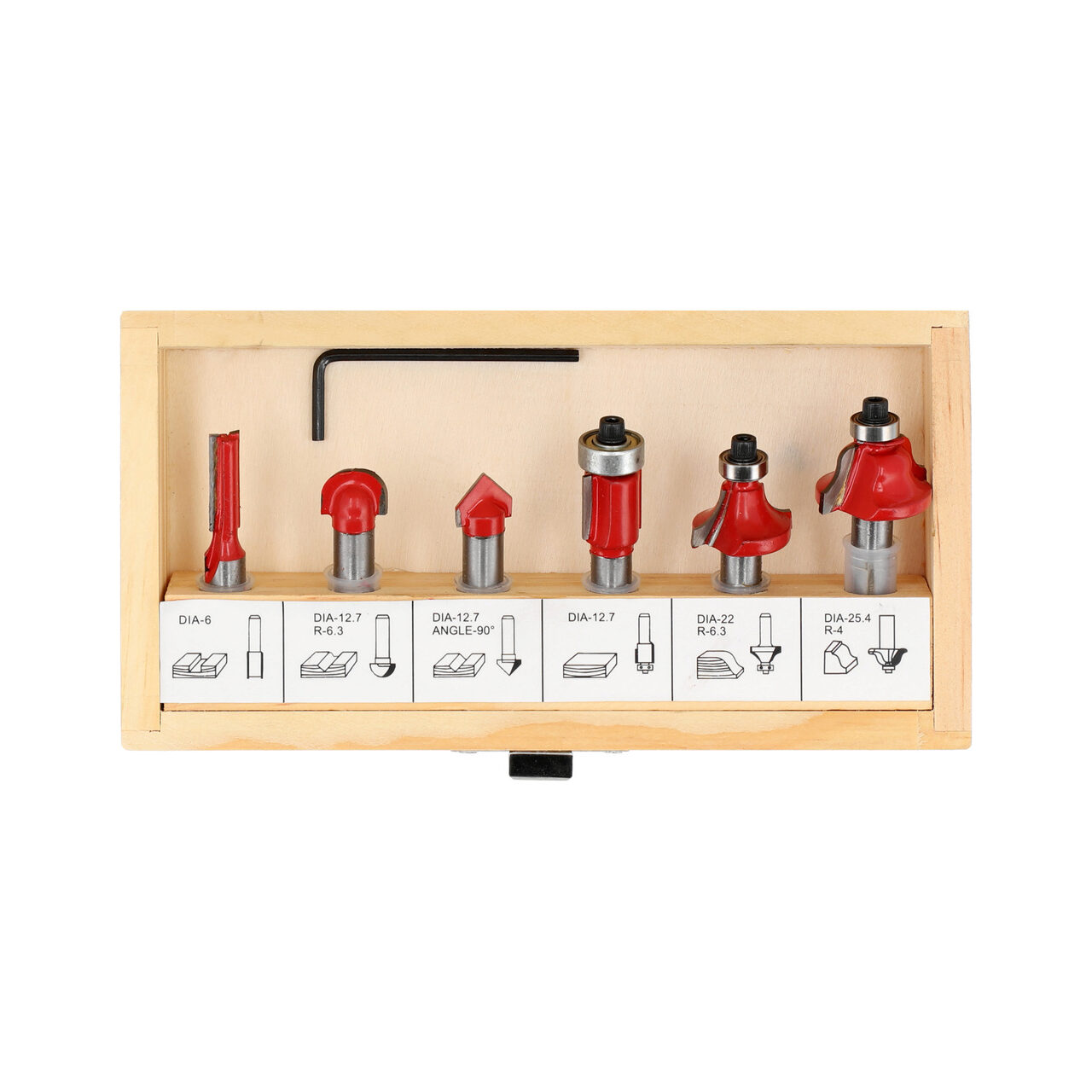 Un set de 6 freze pentru prelucrarea lemnului si a unor materiale plastice cu ajutorul unei masini de frezat cu maner de 8 mm. Freze cu trei muchii se termină cu un rulment care facilitează ghidarea sculei. Setul este ambalat intr-o cutie de lemn.