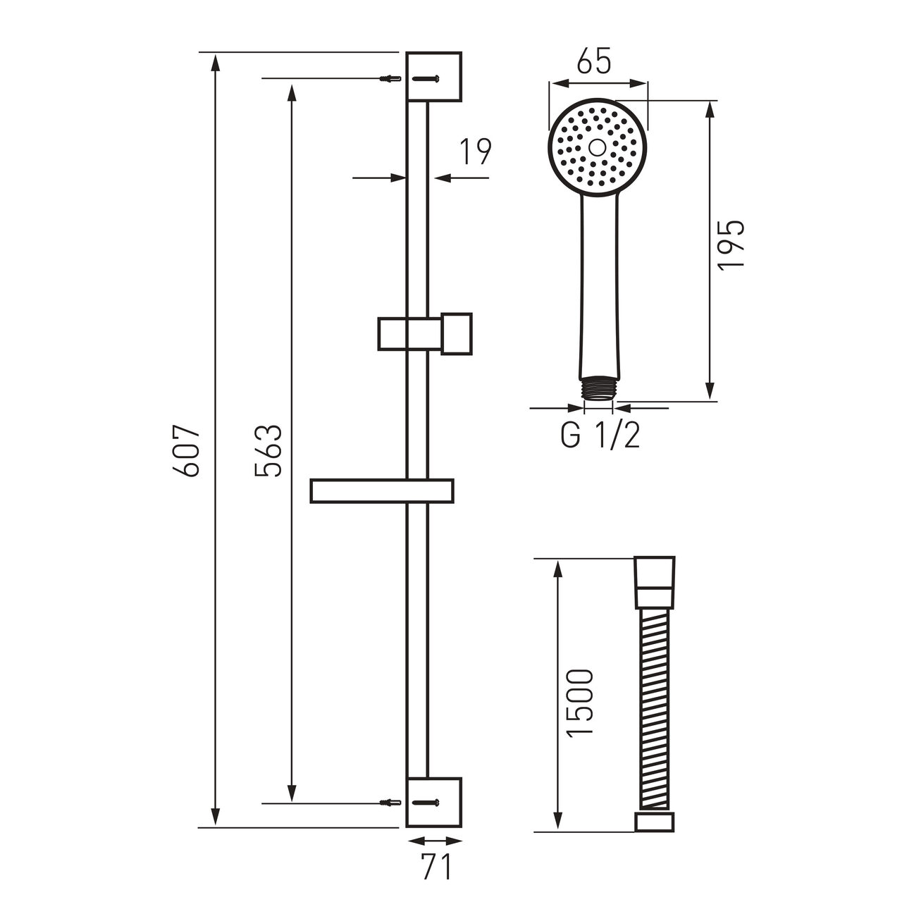 Bara are 607 mm înălțime, iar distanța dintre suporturile de prindere este de 563 mm. Furtunul are 1500 mm lungime.