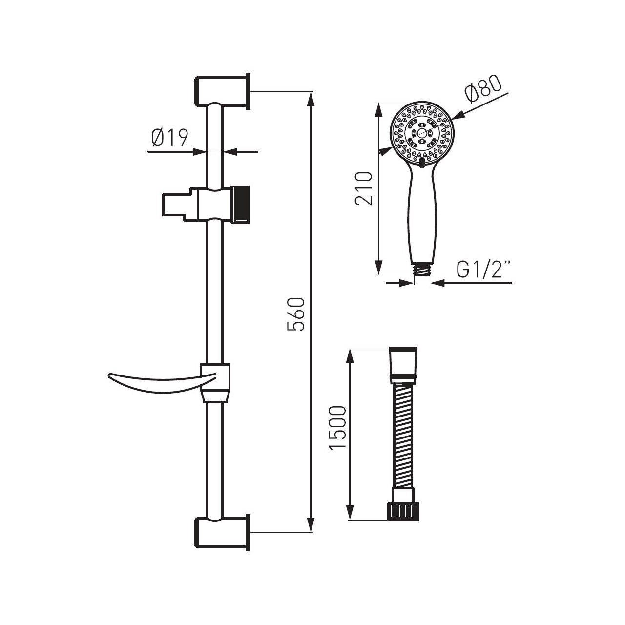 Para de duș are 210 mm și este din ABS; furtunul are 1500 mm și este din împletit metalic; bara are 560 mm, cu distanță între suporturi de 560 mm.