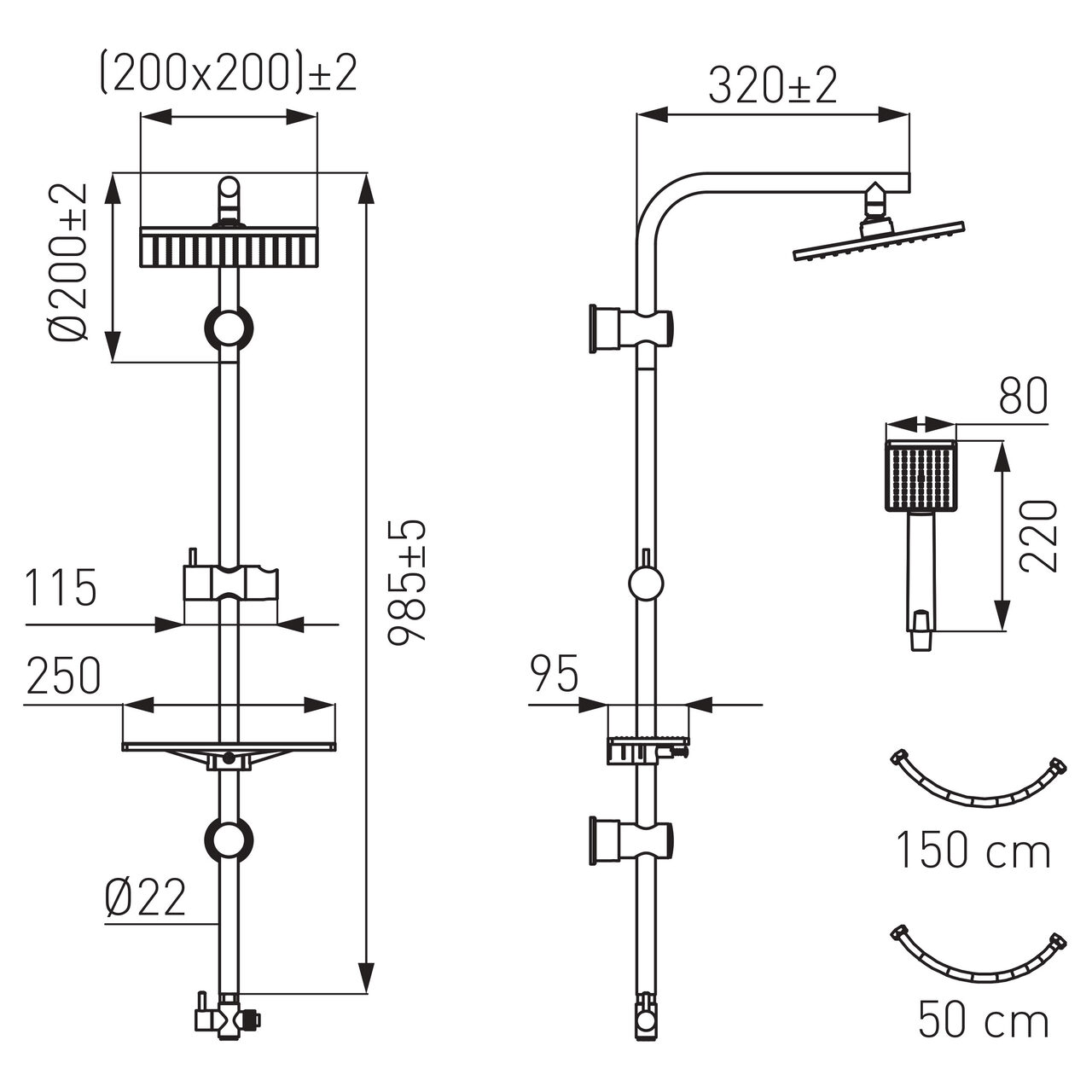 - Înălțime bară cap duș fix: 985 mm