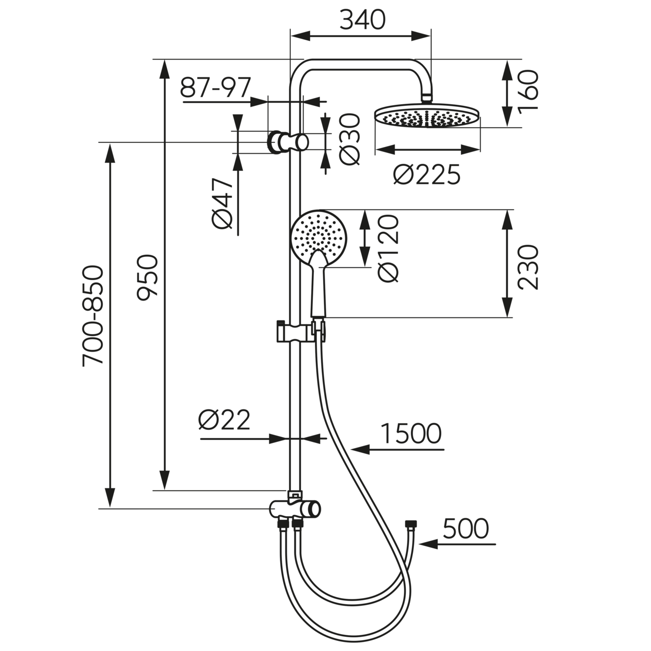 - Înălțime bară cap duș fix: 950 mm