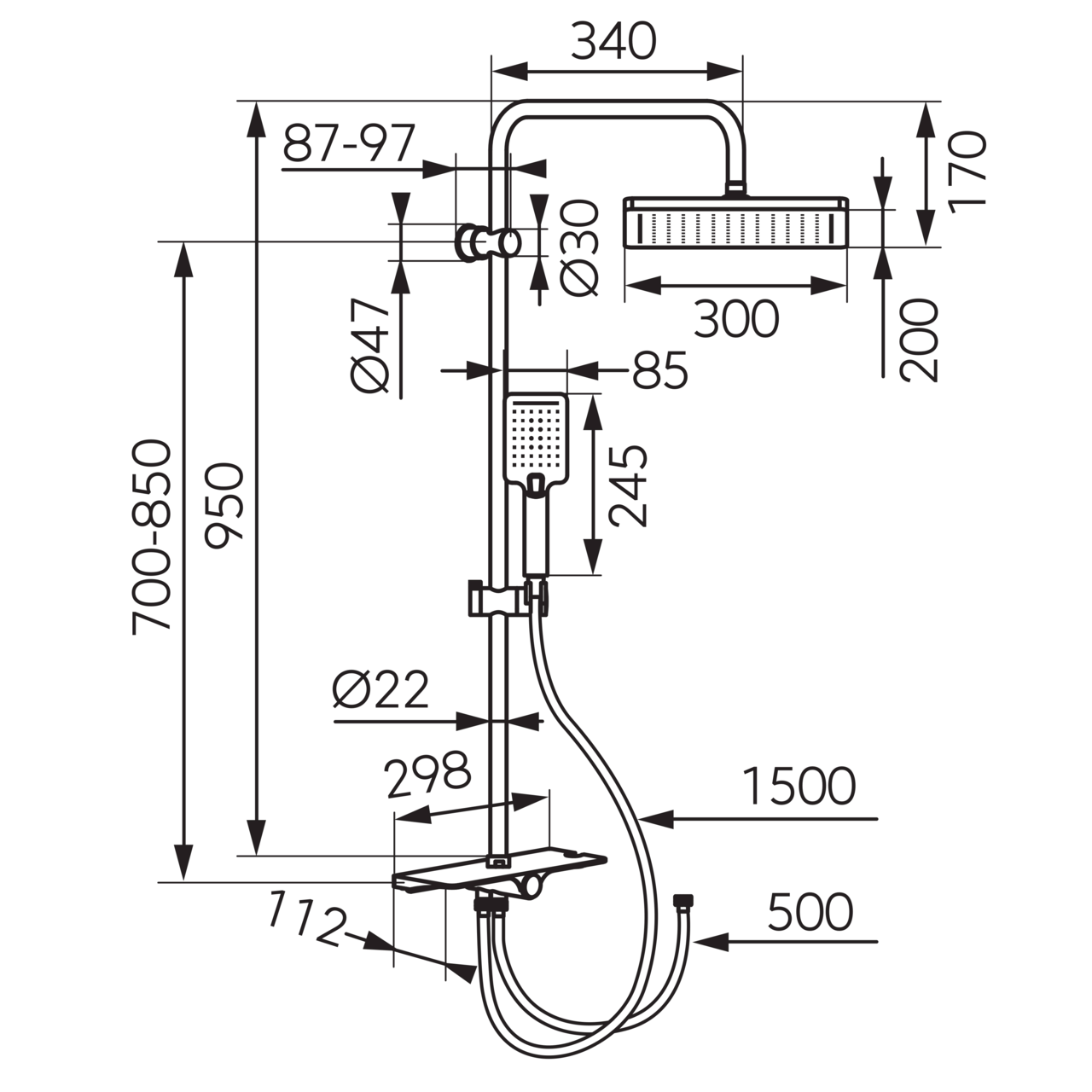 - Înălțime bară cap duș fix: 950 mm