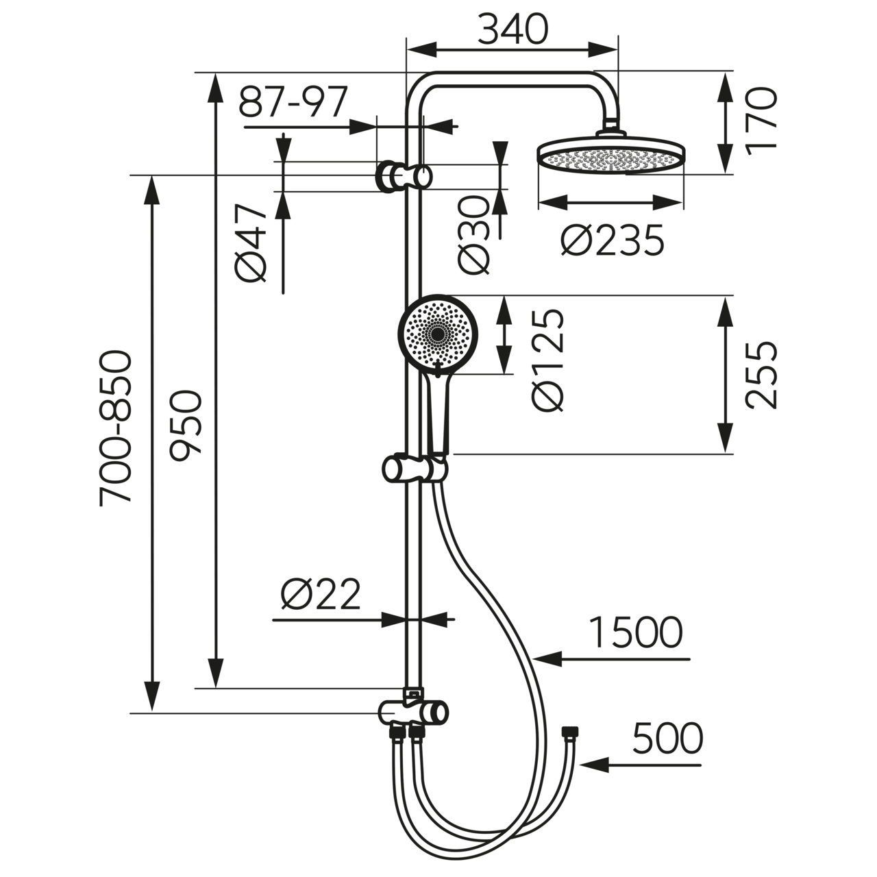 - Înălțime bară cap duș fix: 950 mm