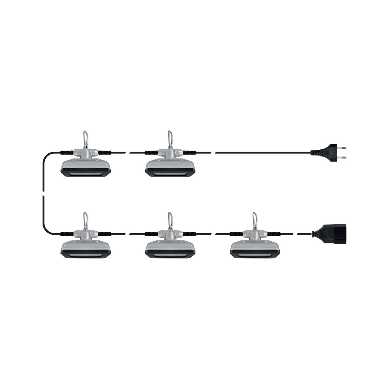 Set de 5 spoturi SMD cu o putere totală de 3000 lm. Spoturile sunt conectate printr-un cablu lung de 15,4 m. Seturile pot fi combinate (maxim 10 seturi). Fiecare spot are un cârlig pentru agățare.