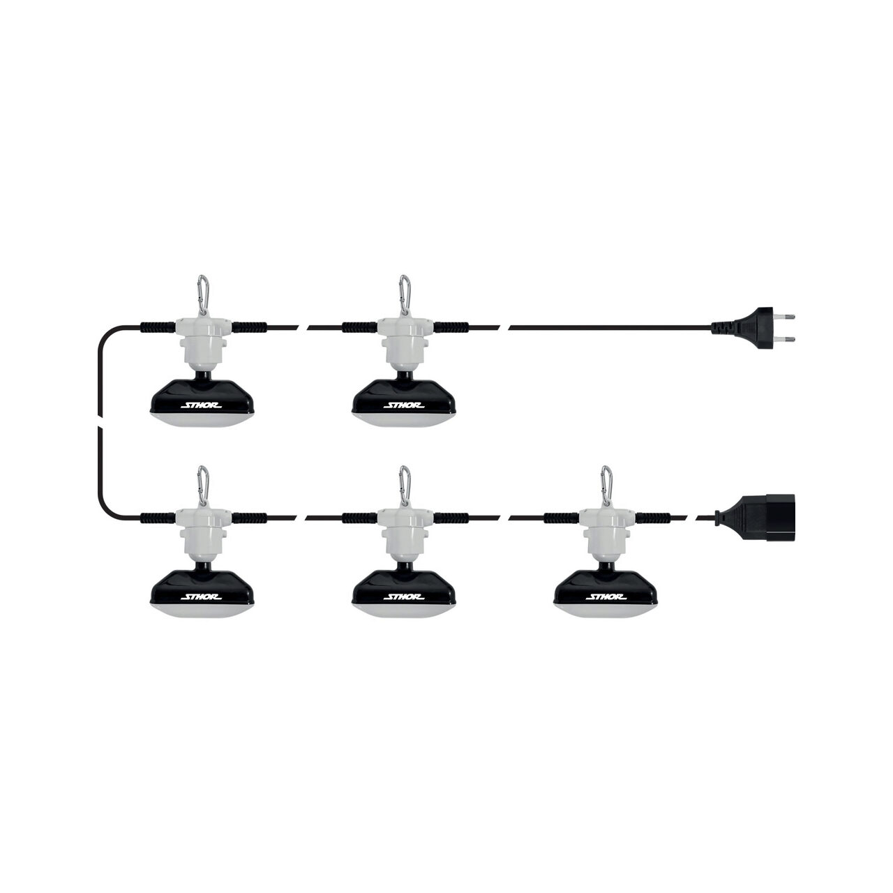 Set de 5 spoturi COB cu o putere totală de 4500 lm. Spoturile sunt conectate printr-un cablu lung de 15,4 m. Seturile pot fi combinate (maxim 10 seturi). Fiecare spot are un cârlig pentru agățare.