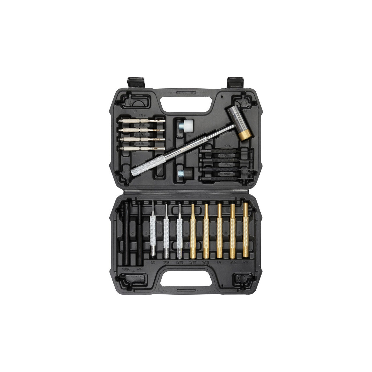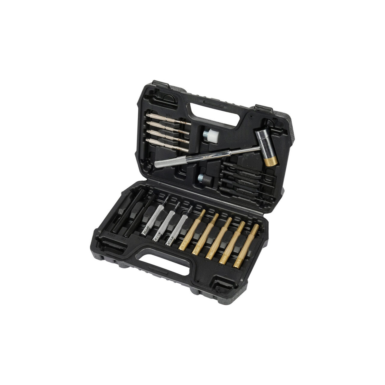 Set de perforatoare pentru ateliere de mecanică de precizie, ceasornicari și bijutieri. Telaș cu vârfuri înșurubabile înlocuibile - oțel, alamă, nailon, cauciuc. Setul este ambalat într-o cutie de plastic.
