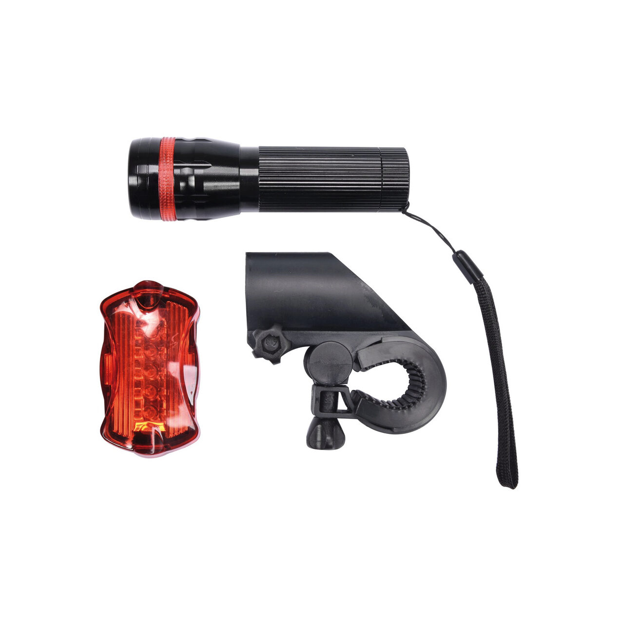 Setul de lumini pentru bicicletă include lumini față și spate și suporturi de bicicletă pentru ambele lumini.