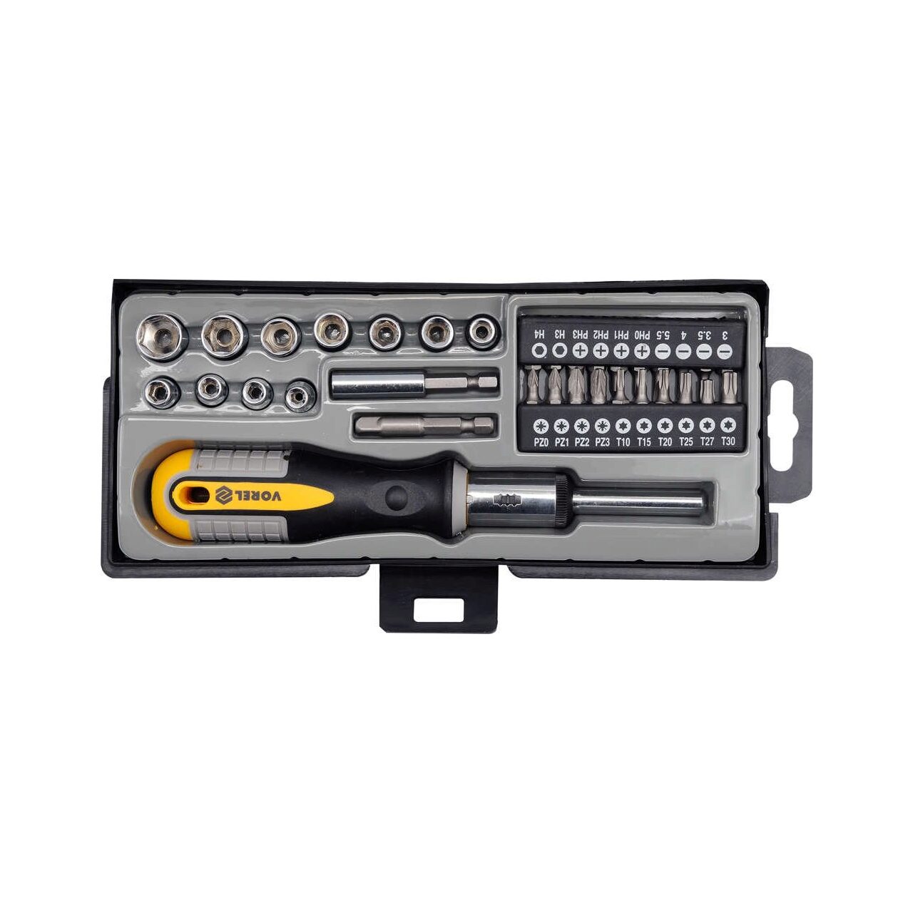 Un set de foarte buna calitate care contine o surubelnita cu clichet si biti Vorel. Bițile sunt fabricate din oțel crom vanadiu de înaltă calitate CrV 6150. Mânerul este din plastic bicomponent, care asigură o ținere sigură în mână. Are un comutator de rotație dreapta/stânga sau un blocaj complet.