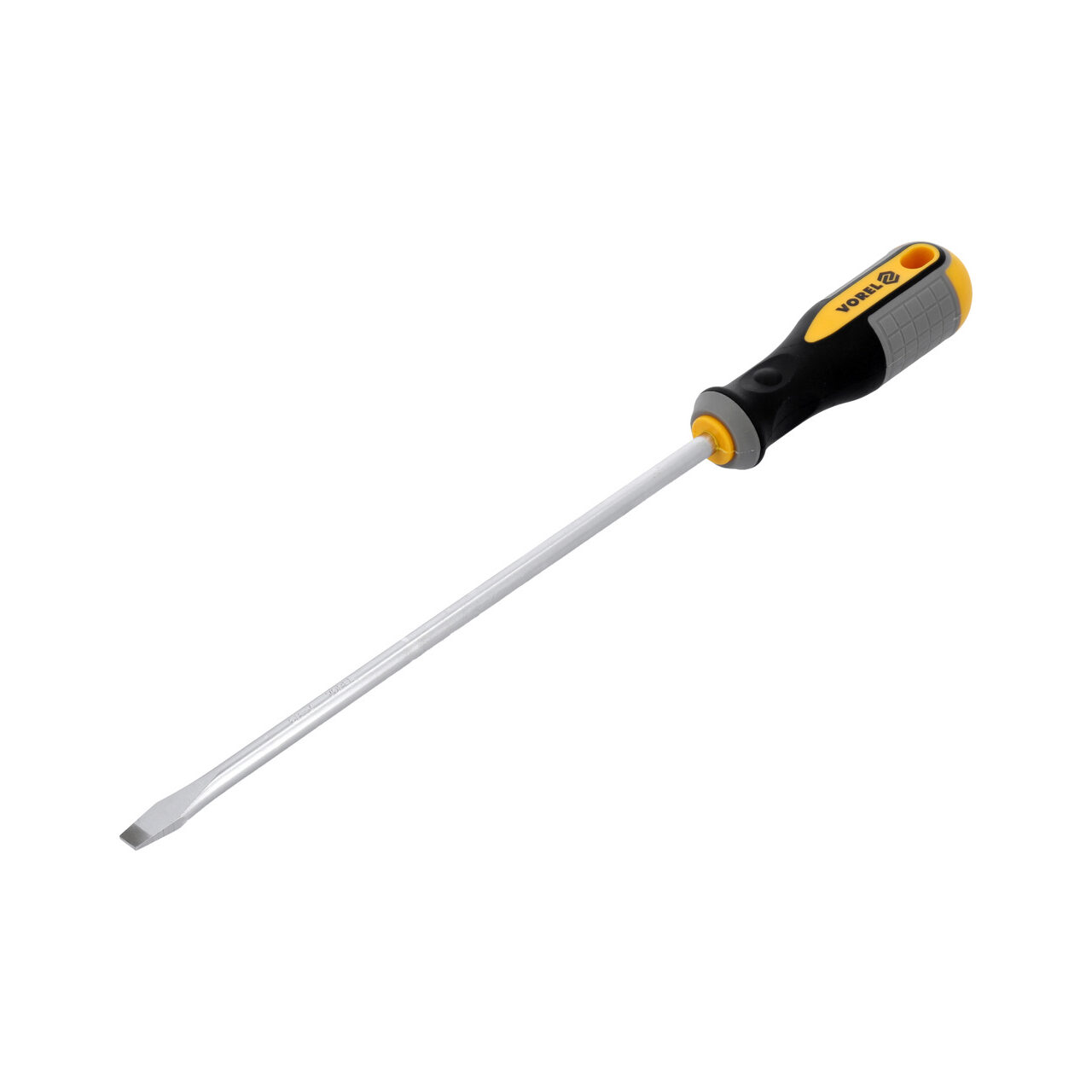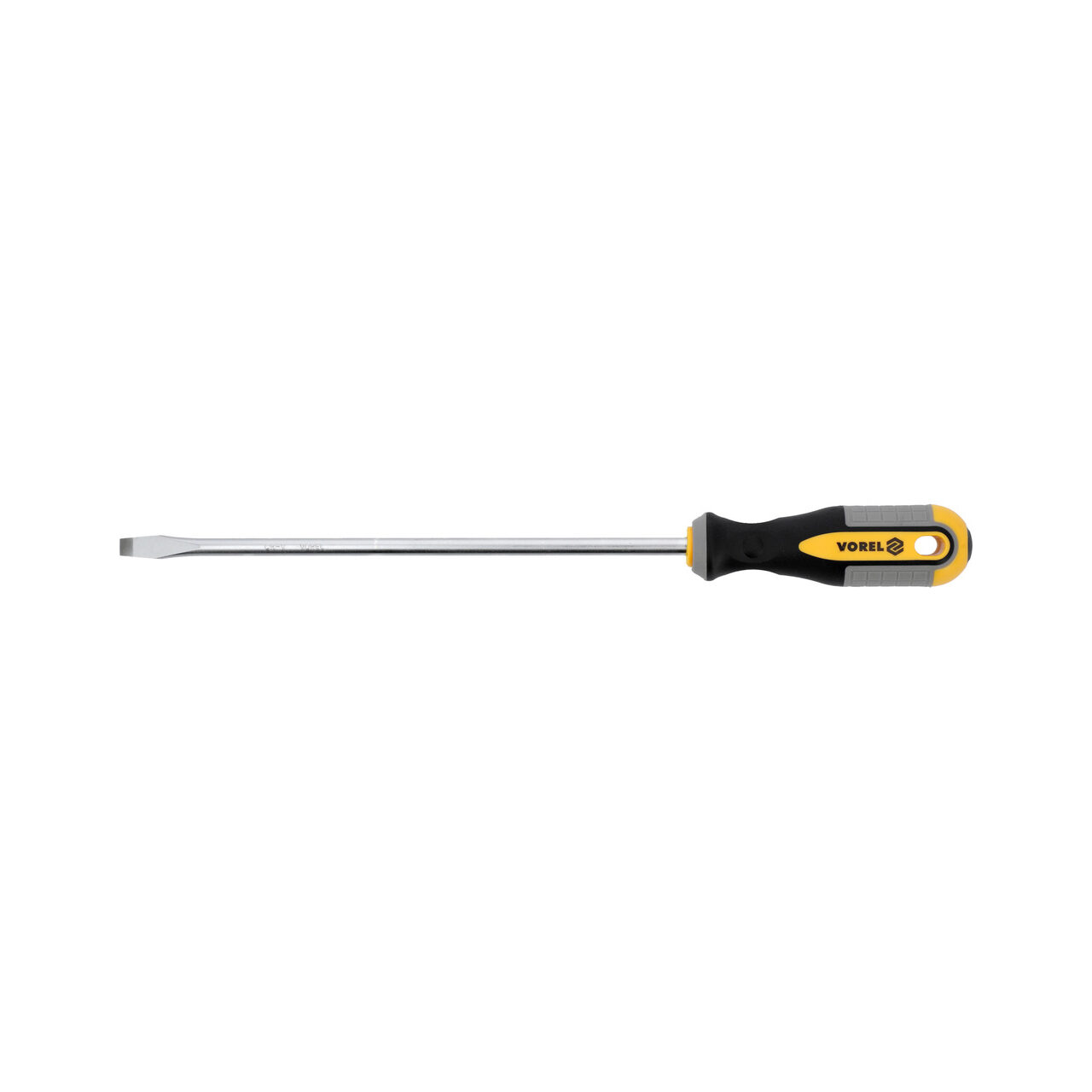Șurubelniță plată marca Vorel 8x250 mm, fabricată din oțel crom-vanadiu CrV. Vârful are un finisaj satinat, suplimentar sablat și magnetizat, care permite o prindere fermă pe capul șurubului. Mânerul este fabricat din plastic bicompozit. Gaura din mâner vă permite să agățați șurubelnița.