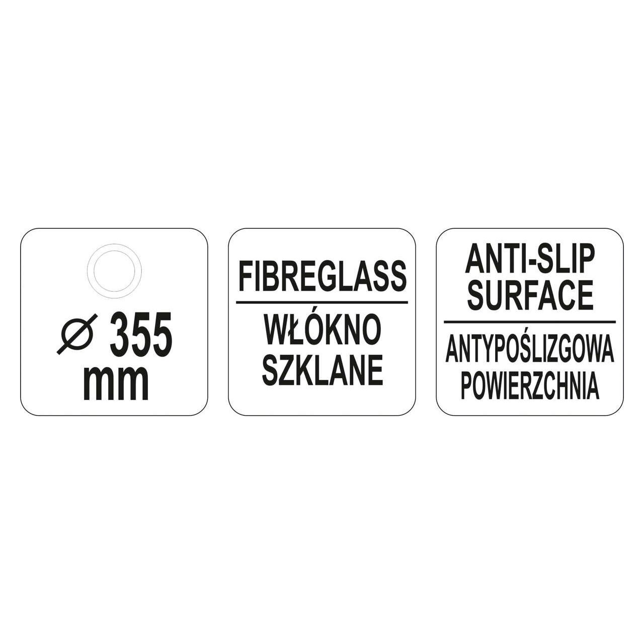 Caracteristici produsTava antiderapantă rotundă pentru chelneri YATO, cu diametrul de 355 mm. Tăvile YATO antiderapante sunt instrumentul esențial al chelnerului în gastronomie. Pentru producția lor s-a folosit fibră de sticlă multistrat, care garantează rigiditate ridicată și rezistență mecanică. Culoarea neagră clasică și designul estetic le permit să fie utilizate în hoteluri, restaurante și baruri. Marginea împiedică căderea produsului și suprafața specială antiderapantă împiedică alunecarea produselor și reduce riscul de alunecare. Tăvile YATO sunt ușor de păstrat curate. Este permisă spălarea acestora cu agenți de curățare disponibili în general în industria de catering. Deși tăvile sunt impermeabile, nu este recomandat să le spălați în mașinile de spălat vase, deoarece agenții de curățare agresivi le pot deteriora suprafețele.Parametrii