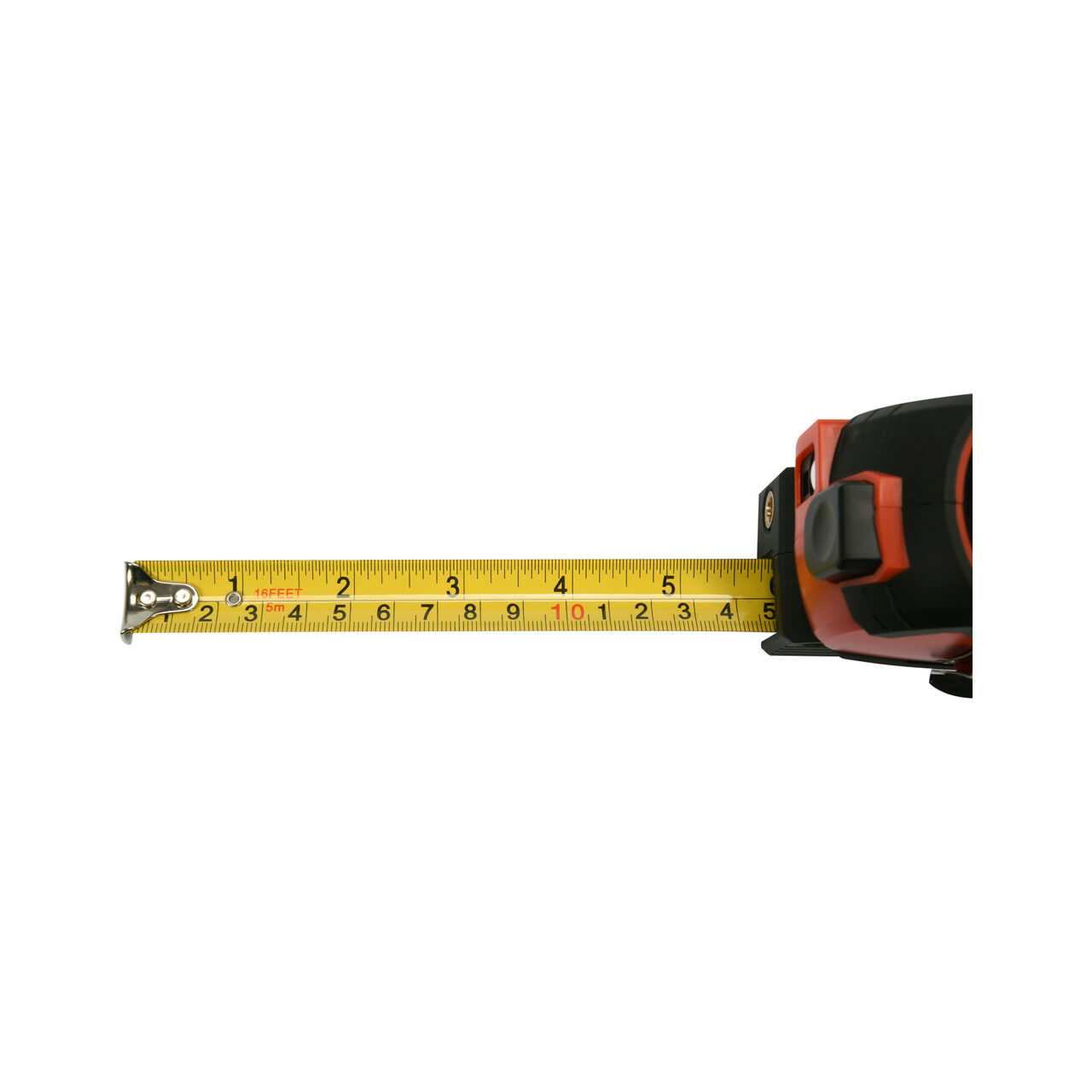 Ruleta are o ruletă de oțel galbenă, lungă de 5 m, cu gradații în milimetri și inch.