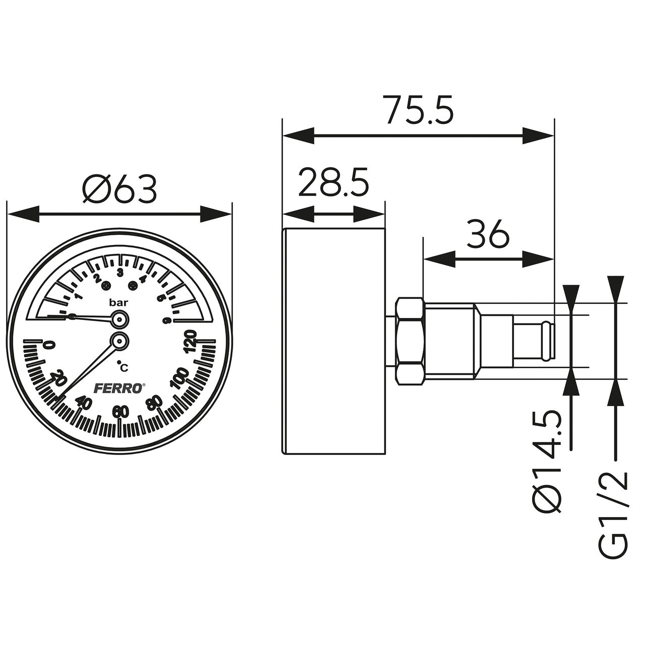 Termomanometru D.63 mm 1/2" axial, 0-6 bari, 120°C, Ferro TM63A - Informații despre acest produs: