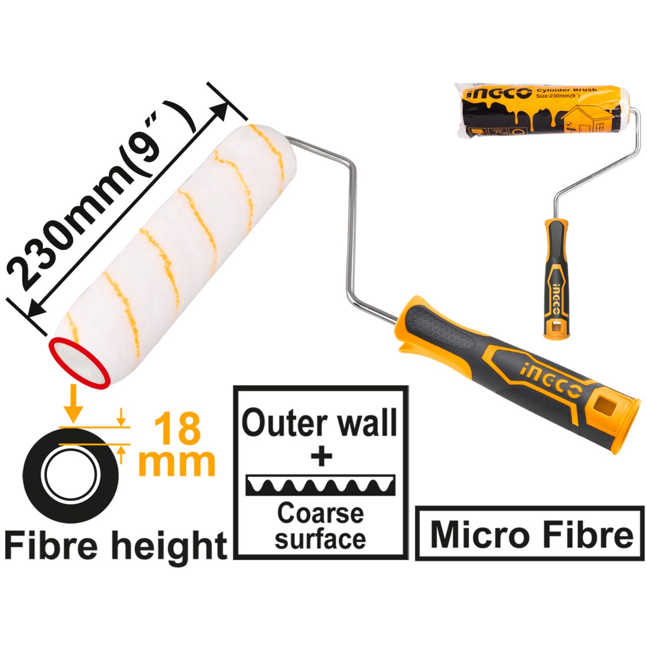 Dimensiuni: 230mm / 8mm (cadru maner);Dimensiune fibra: 18mm;Intrebuintare: Var, vopsea acrilica, vopsea lavabila;Maner: in stil INGCO din pvc, peste care s-a injectat protectie permanent adeziva din TPR cu reliefuri anti-alunecare;Calitate: Premium;Destinatie: Zugravit;Culoare: Multicolor;Domeniu de aplicare: Casnic / Industrial;Utilizare: Interior/Exterior;Material: acrilic + burete;Potrivit pentru suprafete aspre, dure (tencuieli, tinci, structurate etc.);Rola absoarbe si mentine vopseaua foarte bine.