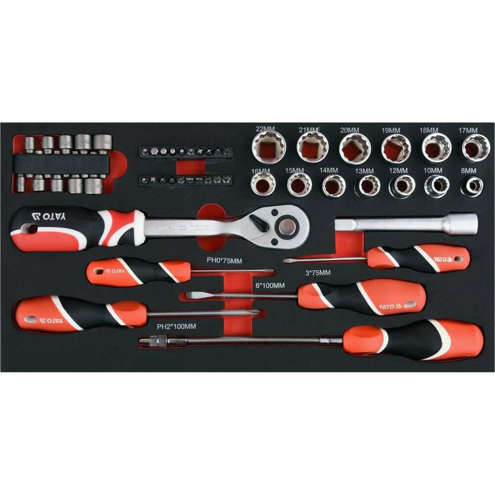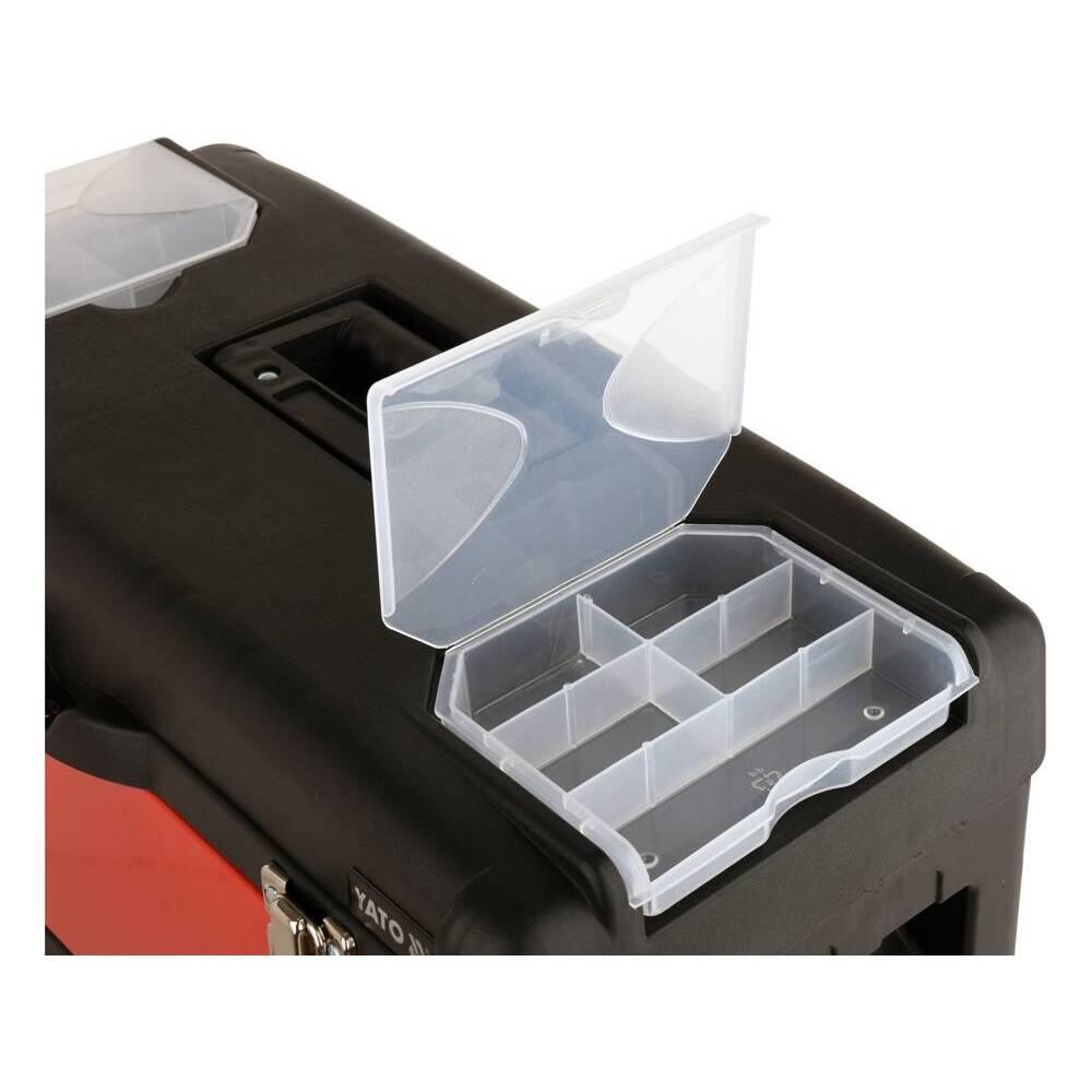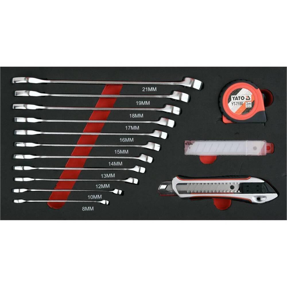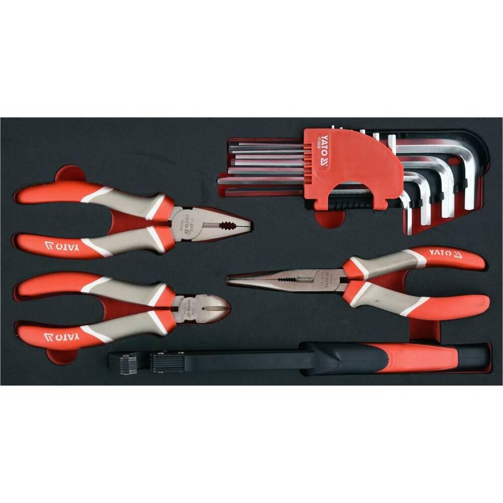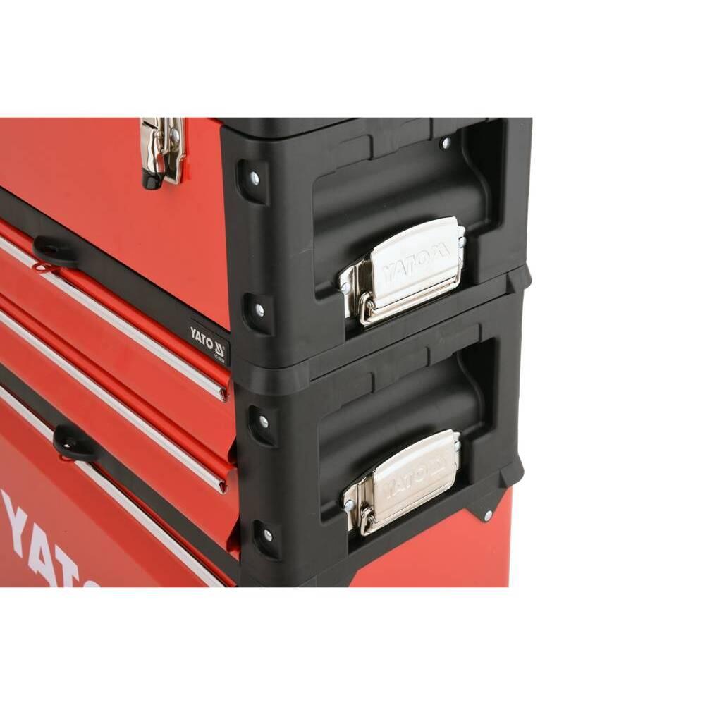 Modulele superioare și mijlocii au elemente de fixare metalice pentru a fi combinate în seturi, iar mânerul din aluminiu are în plus un încuietor pentru a securiza modulele. Tăvile de scule YATO cu seturi de scule gata făcute pot fi așezate în sertare.