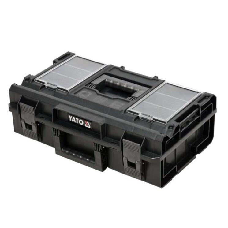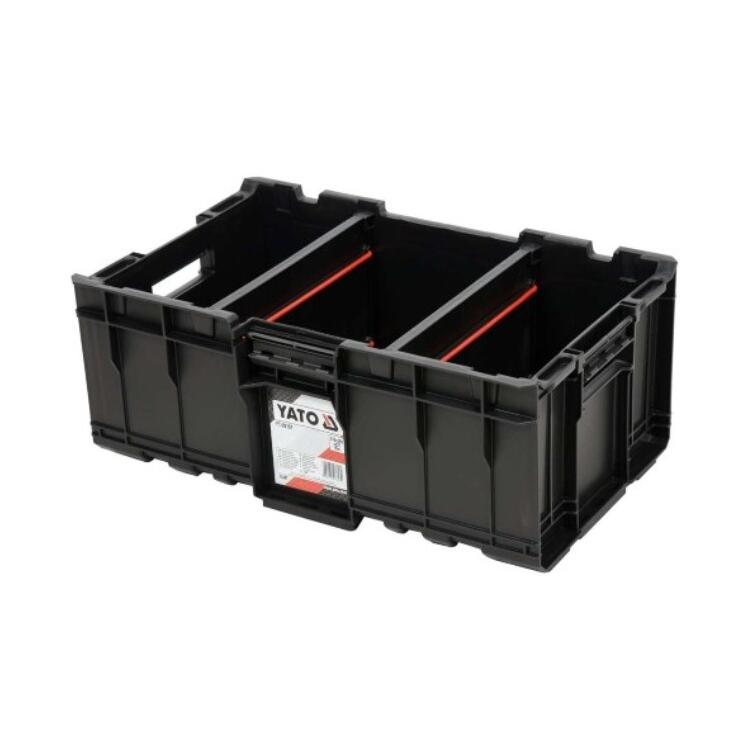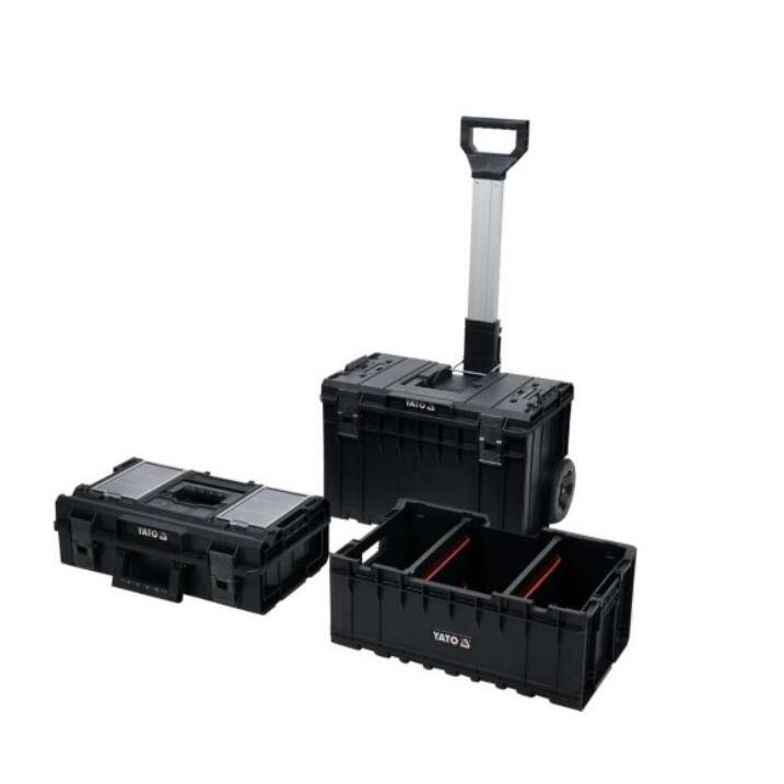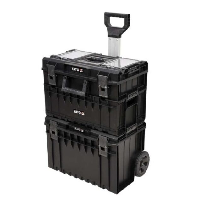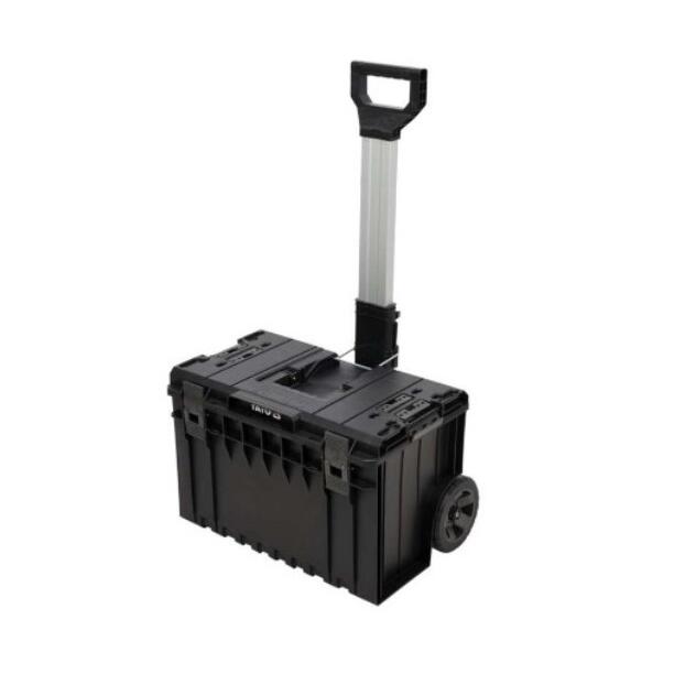 Setul de cutie modular, mobil YT-09161 permite depozitarea comodă a uneltelor și transportul lor ușor. Setul include 3 elemente , care sunt disponibile și separat: cutie de bază pe roți YT-09166, container YT-09168, cutie YT-09169.