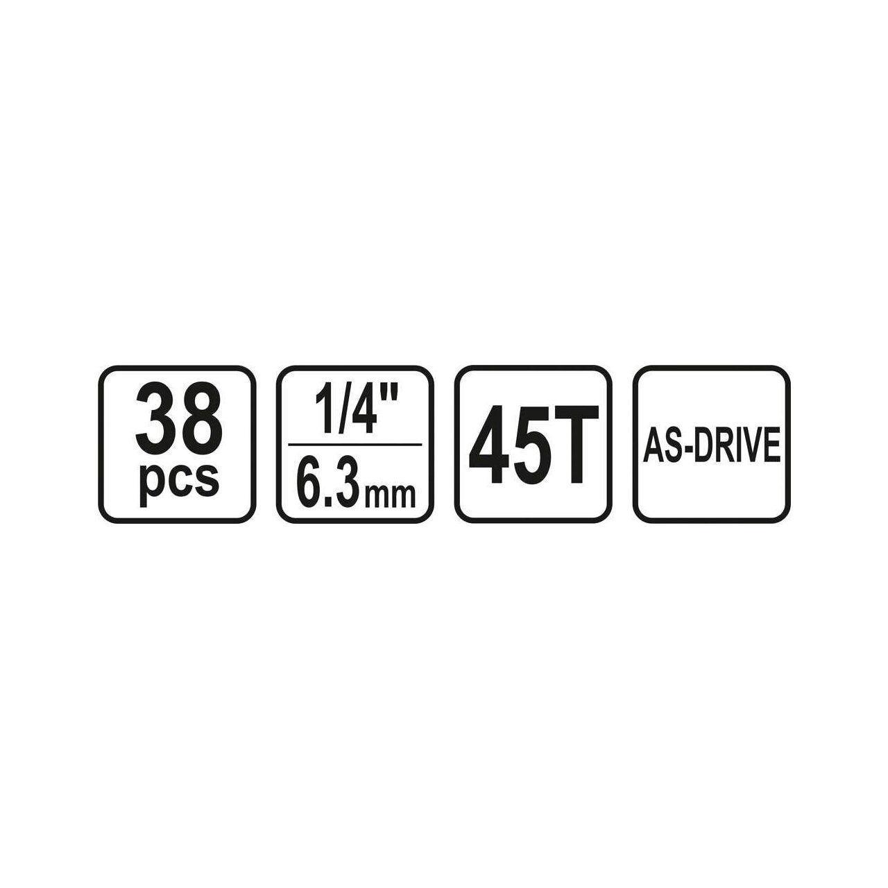 Caracteristici produsSetul de scule STHOR este format din 38 de elemente plasate într-o carcasă din plastic convenabilă. Instrumentele sunt fabricate cu precizie din materiale care le asigură fiabilitatea. Setul include o gamă completă de prize de 1/4 ", biți, extensii, o articulație cardanică și un clichet de 45 de dinți. Această configurație face setul potrivit pentru lucrări mai mici de asamblare, reparații mecanice și multe alte lucrări în gospodărie sau atelier.Domenii utilizareUn set conceput pentru pasionații de bricolaj exigent. Conținutul pachetului- Clichet de 1/4 "45T - Șurubelniță de 1/4" - Îmbinare cardanică de 1/4 "- Extensii de 1/4" x 2 - Buton glisant de 1/4 "- prize de 1/4" : 3,5, 4, 4,5, 5, 5,5, 6, 7, 8, 9, 10, 11, 12, 13, 14 mm - 1/4 "biți hexagonali: 3, 4, 5, 6, 8 mm - TORX1 / 4" biți: T10, T15, T20 , T25, T30, T40 - Biți Phillips Phillips PH1, PH2 - Pozidrive Phillips PZ1, PZ2 - Slotat 4, 5,5, 6,5 mm - CarcasăParametrii- Tipul capacului: AS-DRIVE