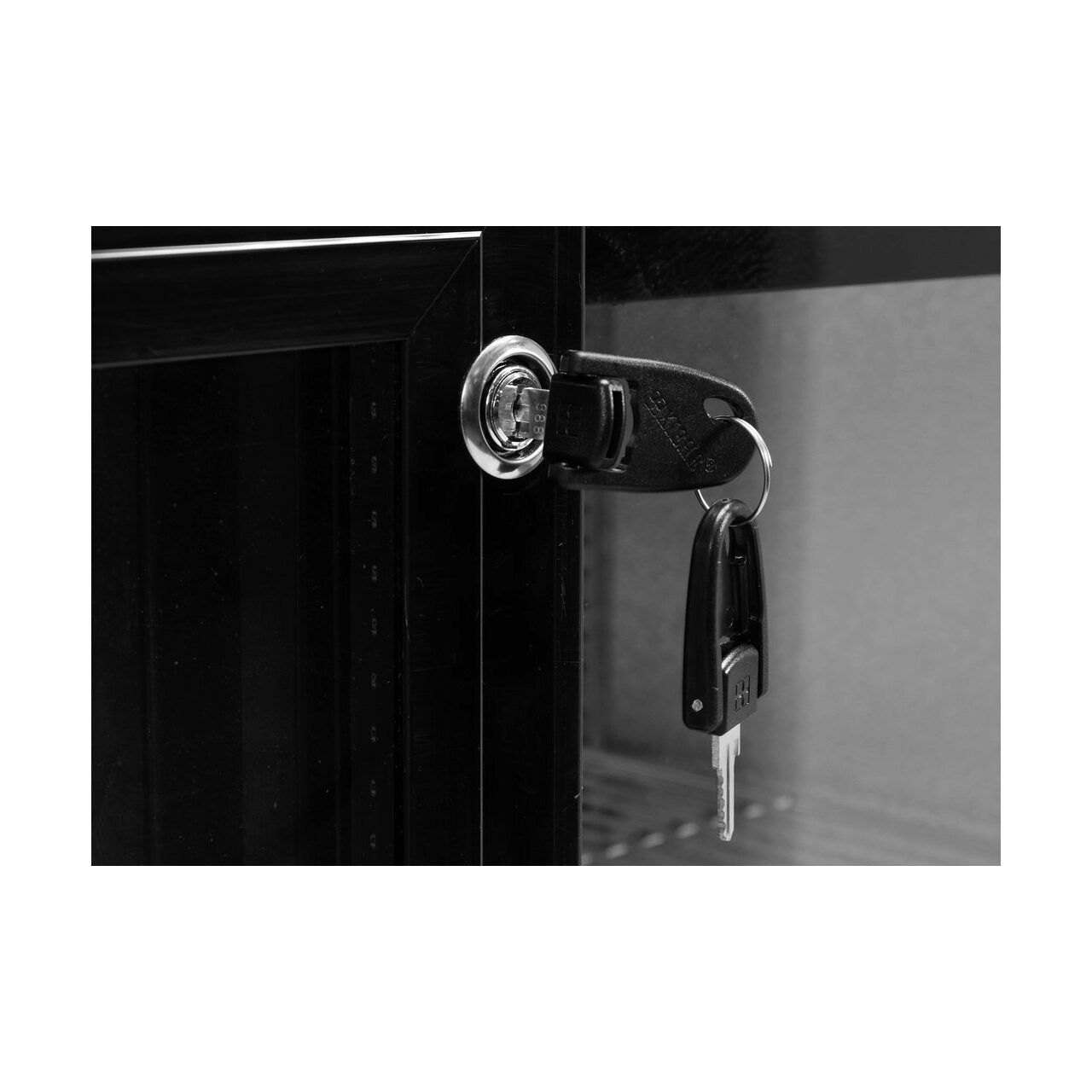 Site - ul are 2 glisante usi realizate din sticlă călită. În plus, acestea sunt echipate cu o încuietoare cu o cheie care permite protecția conținutului împotriva furtului. În centru sunt 4 rafturi cromate cu o capacitate maximă de încărcare de 40 kg - cu sarcină uniformă.
