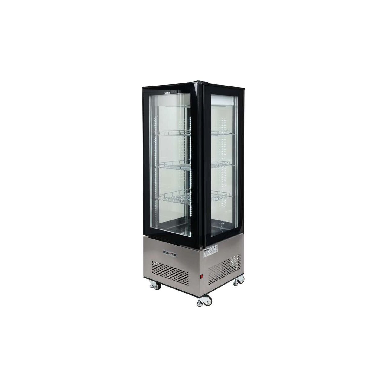 Vitrina frigorifică YATO independentă, cu o capacitate de 400L în negru, dimensiune 650x650x1908mm. Vitrina frigorifică YATO este proiectată pentru afișarea prăjiturilor, prăjiturilor, cocktail-urilor, iaurturilor și a diverse băuturi răcoritoare, precum și salate sau gustări mici. Designul modern combinat cu calitatea înaltă a materiilor prime înseamnă că vitrina frigorifică YATO este perfect prezentată pe față în toate tipurile de cofetării, cafenele, restaurante și magazine comerciale. În plus, iluminarea cu LED instalată din patru părți expune mâncărurile prezentate într-un mod foarte atractiv încurajând clienții să le aleagă. Vitrina frigorifică YATO are o capacitate de 400L și are două rafturi armate și cromate cu înălțimea reglabilă de montare. Accesul la ele se face prin uși de sticlă deschise. Sunt confecționate din sticlă temperată cu două straturi, precum și din sticlă față și laterală. Aceasta asigură o rezistență ridicată și, în același timp, proprietăți izolatoare foarte bune. Locul funcționează în intervalul de temperatură 0 ~ + 12 ° C folosind agent frigorific R290. Pe de altă parte, tehnologia de răcire forțată aplicată și funcția de decongelare automată asigură o muncă foarte eficientă și, în același timp, economisesc energie. În plus, răcirea forțată garantează distribuirea uniformă a aerului pe întregul site, asigurând o temperatură uniformă pe fiecare raft. Website-ul este controlat cu ajutorul unui controler electronic cu afișaj de temperatură . În plus, este instalat un întrerupător de alimentare care vă permite să porniți sau să opriți site-ul în orice moment, fără a-l deconecta de la sursa de alimentare. Vitrina YATO 636W măsoară 650x650x1908mm. În ciuda dimensiunilor atât de mari, amplasarea sa oriunde este foarte ușoară și convenabilă. Datorită construcției speciale a roților, site - ul poate fi mutat fără niciun efort în locul desemnat. Pe de altă parte, picioarele detașabile stabilizează situl și permit nivelarea acestuia.
